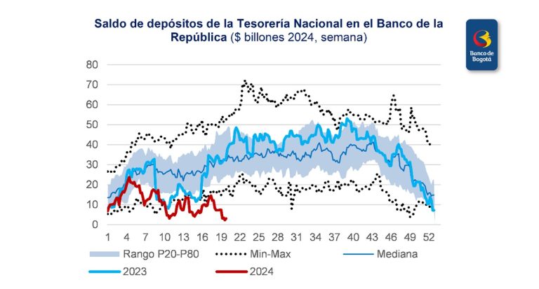 La disputa se vio reflejada por el bajo nivel de recaudo de la DIAN, lo que ha dejado un enorme hueco de disponibilidad de efectivo del Tesoro Nacional. Al 25 de abril de 2024, la tesorería de la nación cayó a un mínimo de $3 billones de pesos, muy por debajo de un año atrás ($31 billones) y lo habitual para esta fecha ($32 billones). Esto es preocupante ya que la Nación no tendría los recursos suficientes contemplados para ejecutar los proyectos, planes y programas de la vigencia 2024. Aunque podríamos hablar de la baja ejecución de todas las entidades del orden nacional, es un tema para otro día.