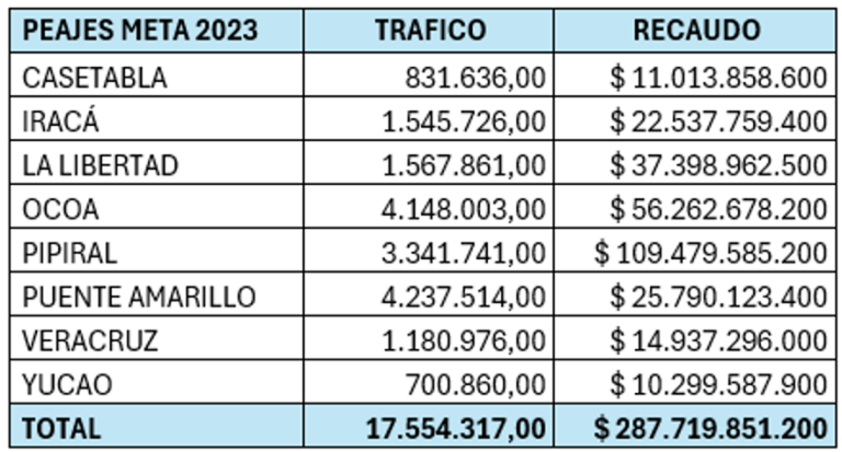 Son tres las concesiones viales: Coviandina, Covioriente y Concesión Vial de los Llanos, dirigidas por grandes conglomerados financieros, que cuentan con al menos un peaje dentro del Meta. Estos peajes recaudaron en 2023 más de $287.000 millones de pesos.