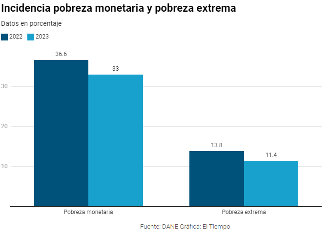 El último informe del DANE sobre pobreza monetaria en el 2023, arrojó que 1,6 millones de personas dejaron de estar en la pobreza, pasando del 36,6% en 2022 al 33% en 2023. Asimismo, informó que 1,1 millones de personas dejaron de estar en la pobreza extrema, pasando del 13,8% al 11,4%.