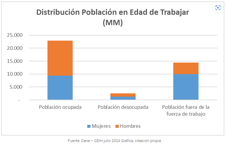Por ejemplo, casi la mitad de las mujeres en edad de trabajar, se encuentra en la informalidad, de acuerdo a la categoría que el DANE asigna como “población fuera de la fuerza de trabajo”, mientras que para los hombres, esta misma cifra se ubica en apenas el 23%, conforme a las cifras de diciembre del 2023.